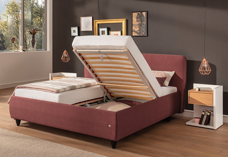 Auch das besondere Belüftungskonzept optiVENT®, das für einen belüfteten Bettkasten sorgt, trägt zum Wohlfühlklima bei. So sorgt der großzügige Stauraum im Bettkasten für eine aufgeräumte Atomosphäre im Schlafzimmer. Bei „Apulia“ stehen ausserdem die komplette Fuß-Kollektion aus 15 cm oder 20 cm hohen Bettfüßen zur Verfügung.