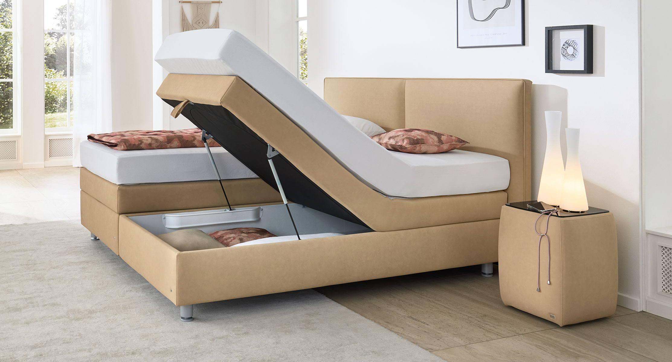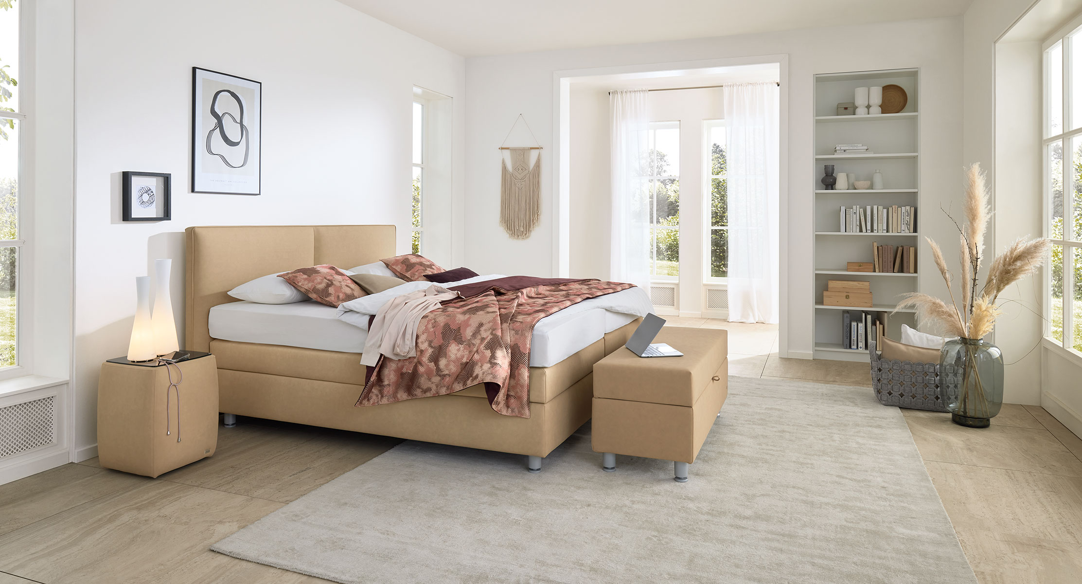 Das einzigartige AIRVent-System erzielt einen optimalen Temperatur- und Feuchtigkeitsausgleich. Während die Federkerne naturgemäß luftdurchlässig sind, sorgen spezielle Bohrungen in den Schaumkomponenten bzw. Fräsungen in der Bodenplatte für eine kontinuierliche Luftzirkulation. Mehr noch: Beim durchdachten QLX-Boxspring-System ist auch der Abstand zum Boden über 5 oder 10 cm hohe Füße wählbar. Dadurch wird die maximale Belüftung des Boxspringbettes mit QLX-System zusätzlich unterstützt. Dies garantiert Ihnen ein frisches Bettklima – rund um die Uhr.