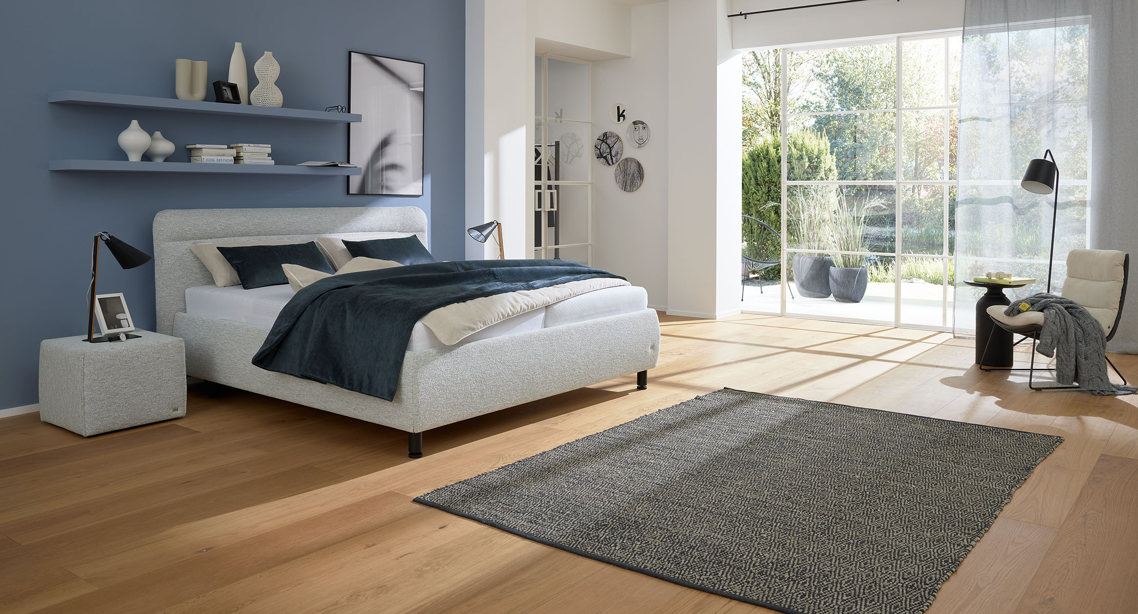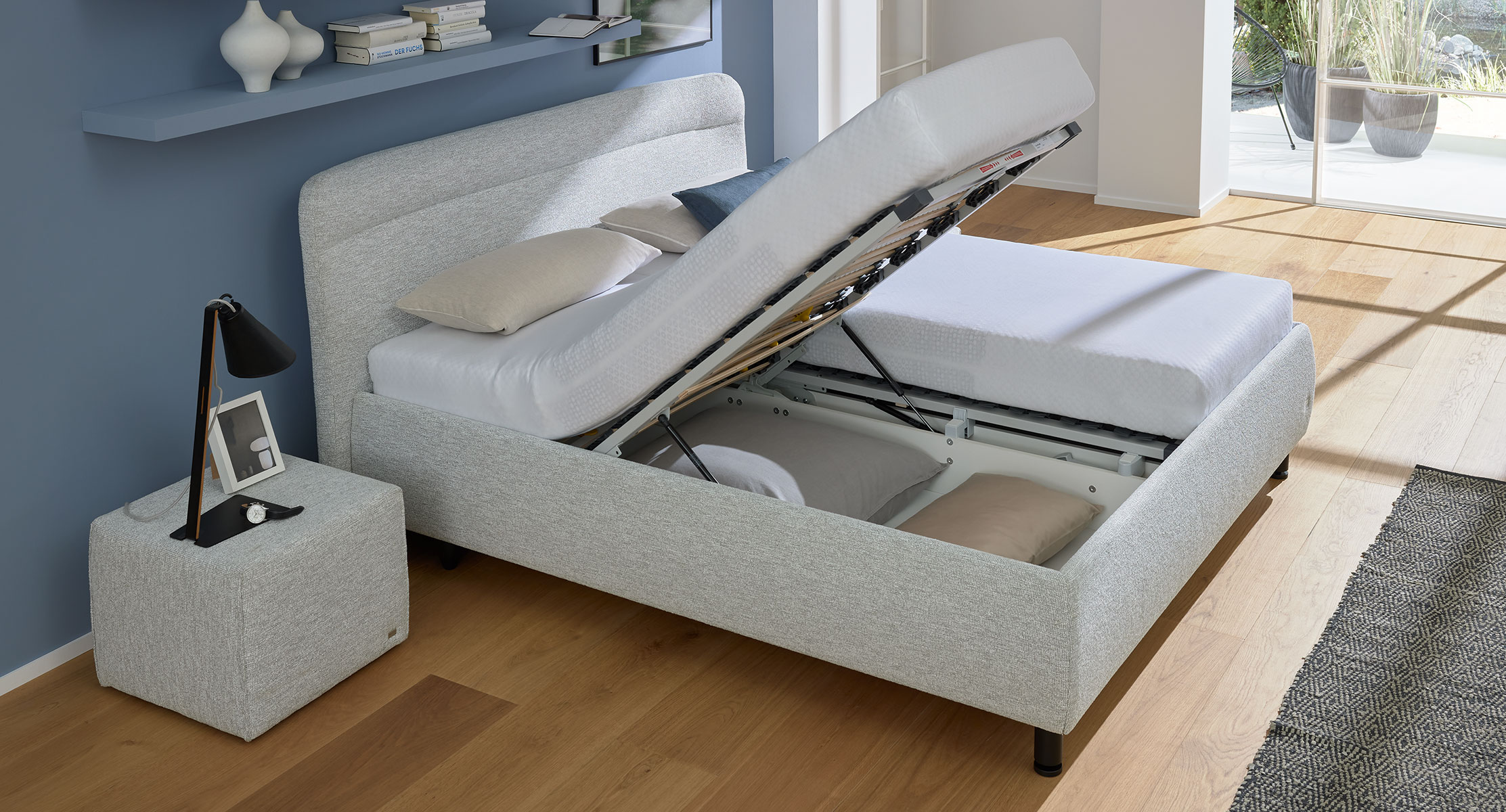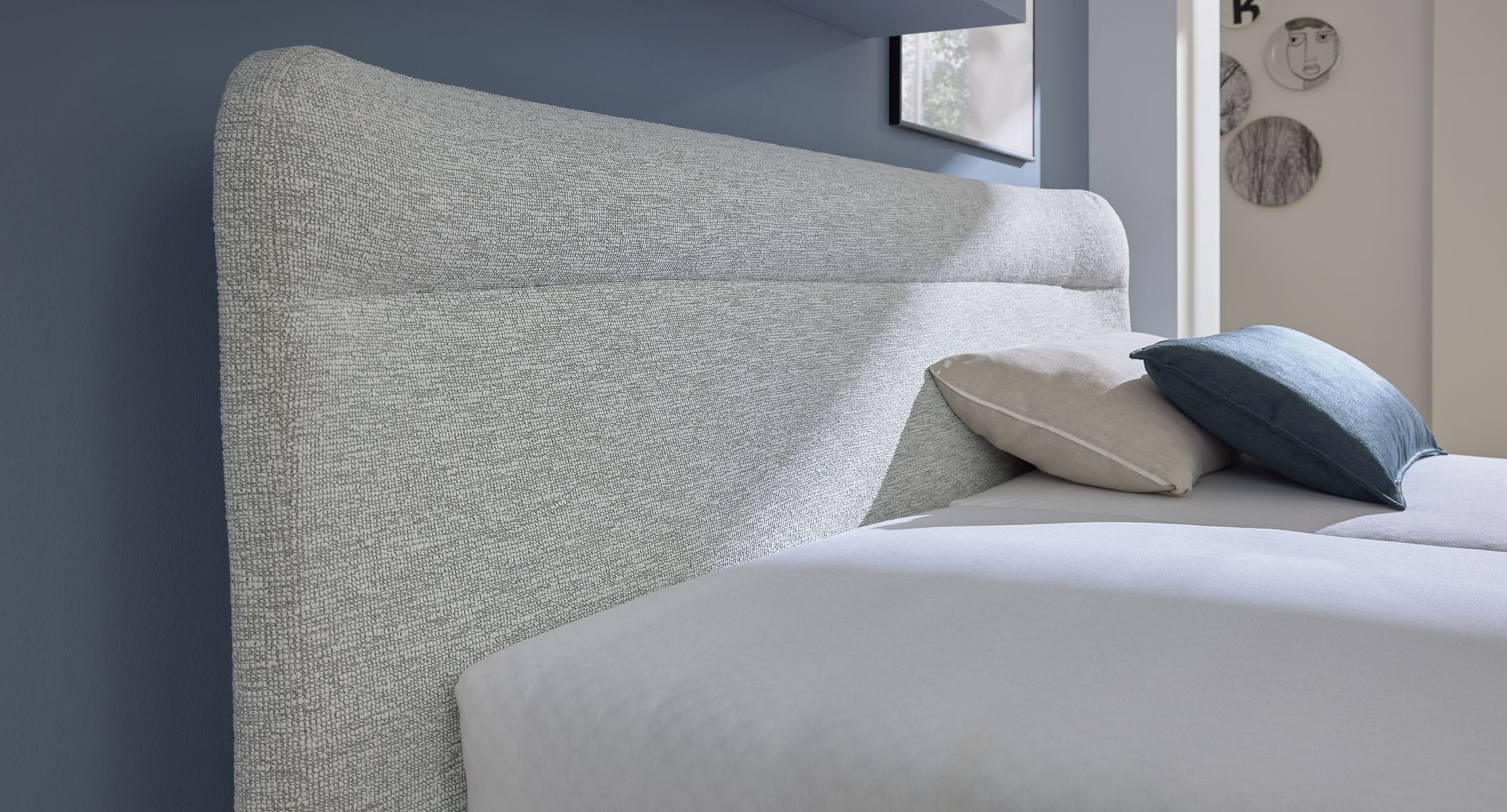 Genießen Sie das Gefühl von Geborgenheit und luxuriöser Entspannung mit dem Polsterbett COSY. Die elegant nach innen gebogenen Seiten des Kopfteils schaffen eine einladende Cocooning-Atmosphäre, die Ihren persönlichen Rückzugsort perfekt abrundet. Der bombierte Bettunterbau passt nicht nur formschön zum Kopfteil sondern bietet Ihnen zudem einen geräumigen Bettkasten mit optiVENT®-Belüftung. Wählen Sie nun nur noch zwischen einer Tonnen-Taschenfederkern- oder Spezialschaum-Matratze und die Nacht kann kommen.
