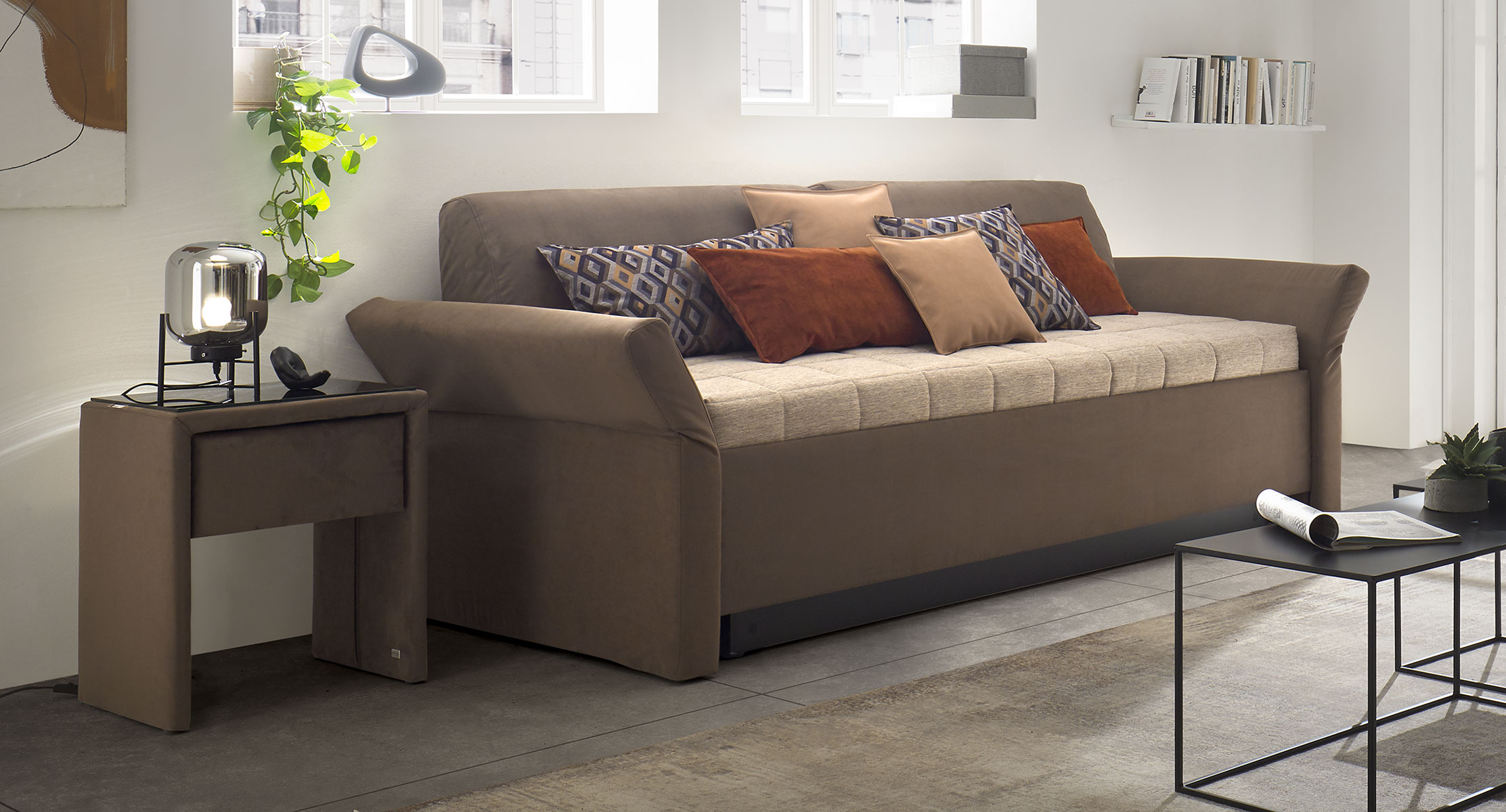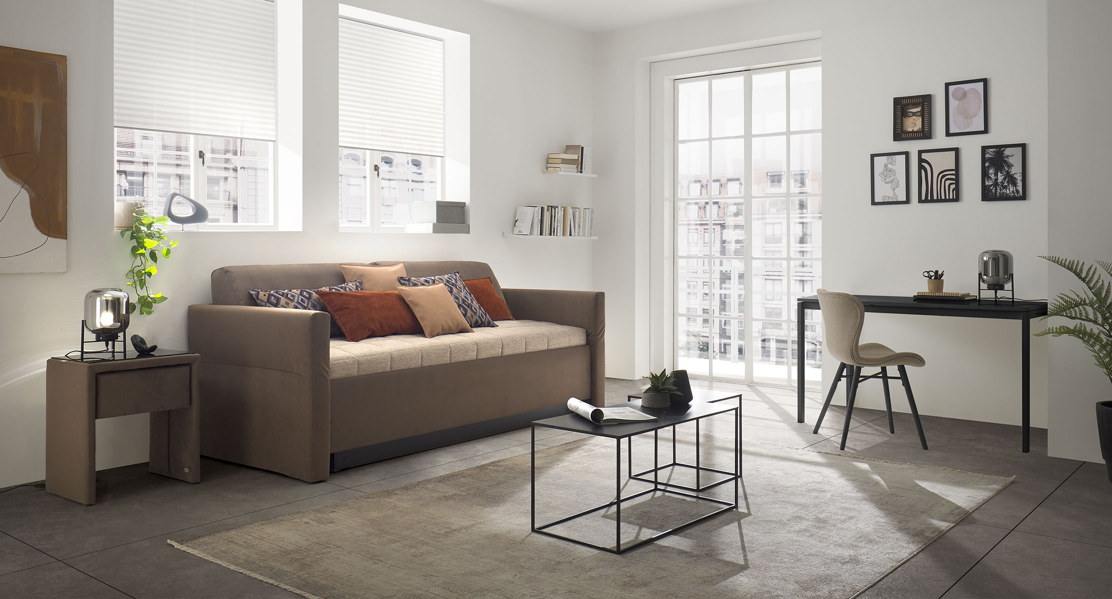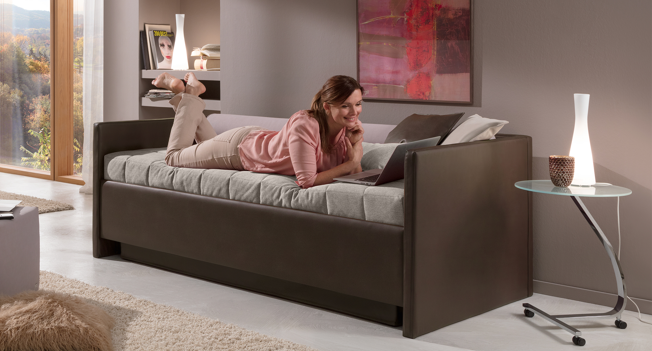 Unser kleines Stauraumwunder. LIDO ist das ideale Bett für Singles, die ihren Platz clever nutzen und gleichzeitig traumhaften Komfort genießen wollen. Im Schlafzimmer wirkt dieses Stauraum-Wunder nicht so wuchtig und lässt sich auch perfekt in kleinere Räume integrieren. Für Studios oder als Gästebett ist dieses Bett, mit einer Liegefläche von 80 bis 120 cm, die optimale Lösung. Ob als Liege, Einzelbett oder Sofa mit hoher Rückwand: Das kleine Liegenprogramm, in sieben verschiedenen Looks, bietet Ihnen große Gestaltungsvielfalt. Wir erwähnen dann nur mal kurz, die große Federholzrahmenauswahl, die Sockelblenden in textil oder verspiegelt, oder die motorische Verstellung. Und wenn es mal schnell gehen muss, sind alle Kissen ruckzuck im geräumigen, belüfteten Bettkasten verschwunden.