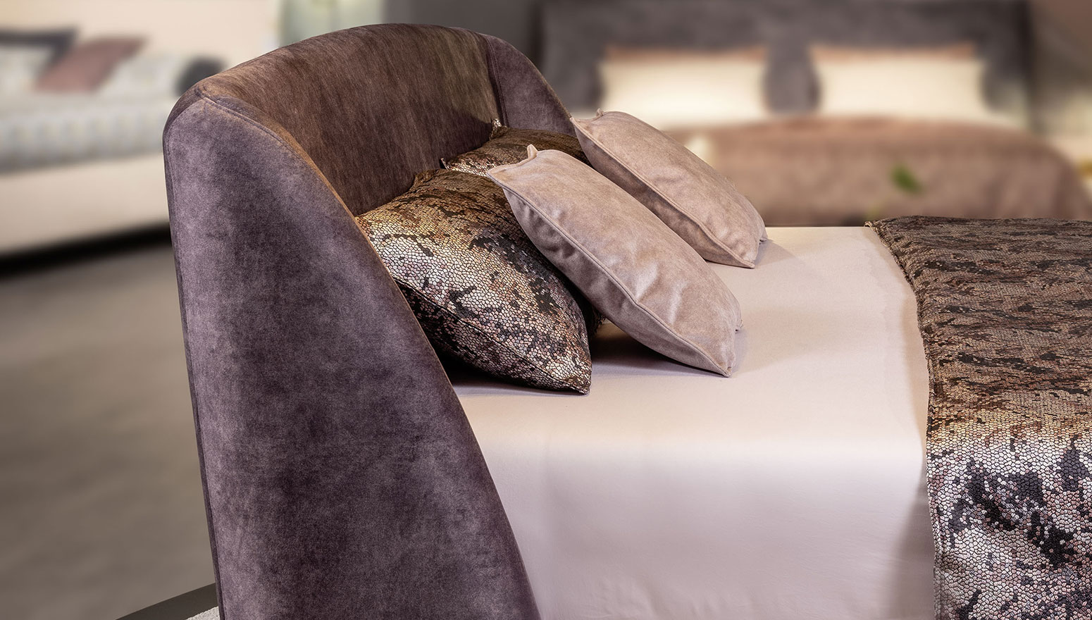 Ein leichter Schwung macht dieses Kopfteil in angedeuteter Kissenform mit Zweiteilung unverwechselbar und gibt ihm eine grazile Schönheit mit hohem Anlehnkomfort. Ergänzt durch hochwertige Bezugstoffe, fügt es sich in Farbe und Design hervorragend in jedes Schlafzimmer ein.