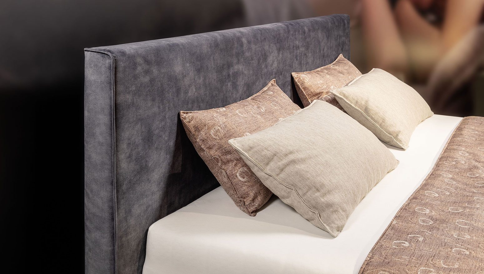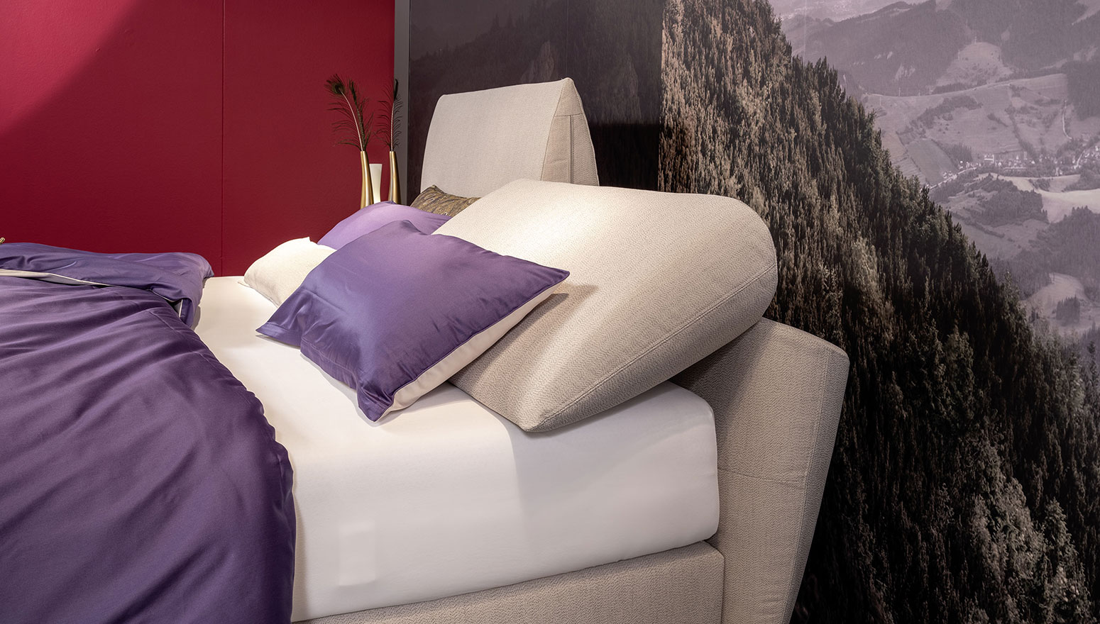 Mit dem eleganten Kopfteil KTS setzt man, dank der handwerklich ausgeprägten Nahtunterteilung in gestreckter V-Form, ein Statement. Die dynamische Unterteilung in Kopf- und Schulterbereich bietet hervorragenden Anlehnkomfort und bringt Harmonie ins Schlafzimmer.