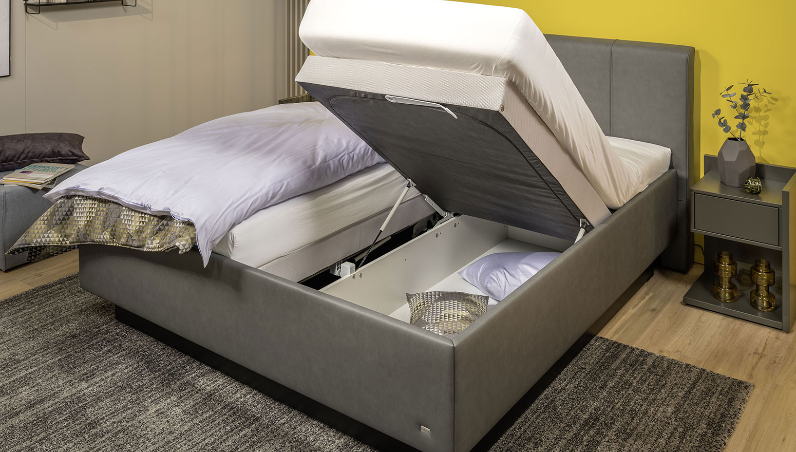Zeitlos schön und doch unendlich praktisch. Das Polsterbett LIGURA vereint Eleganz mit höchstem Komfort. Formschönes Design eingefasst mit einem prägnanten Keder, bodenstehend mit riesigem belüftetem Bettkasten und dann noch quer zu öffnen, damit man auf die volle Länge einfach an alles kommt, was man gut verstaut haben möchte. Bester Liegekomfort mit wählbarer Matratze und Federholzrahmen natürlich inklusive. So sieht Luxus aus.